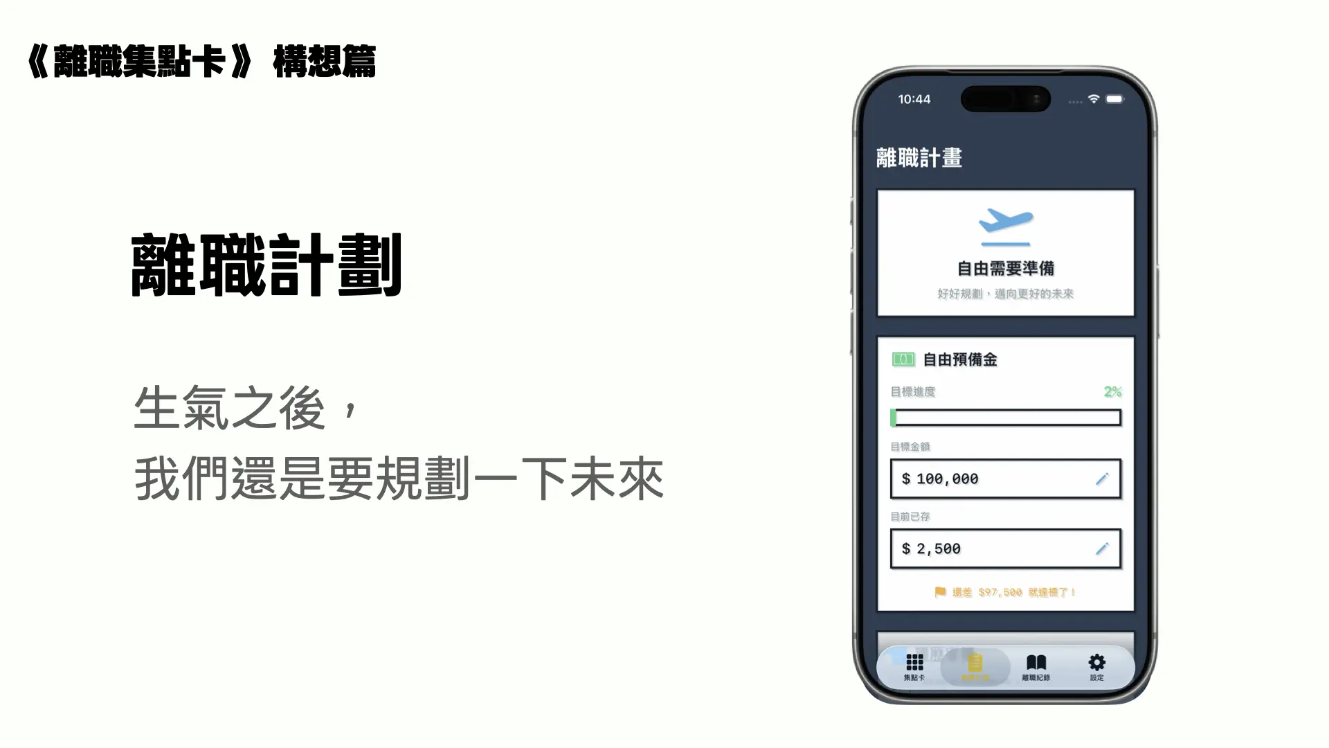 但在一開始構想時,我就很清楚,這個 App 不能只停留在情緒層面。離職如果只有情緒,沒有準備,其實風險很高。所以我放進了一個很簡單的離職計畫概念,裡面有自由預備金,可以填目標金額和目前進度。它不是在教你理財,而是讓你在情緒之外,多一個「我準備好了嗎」的參考。